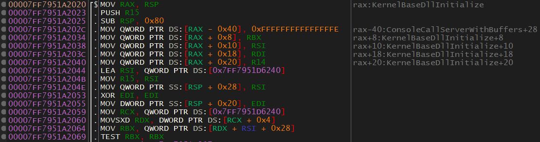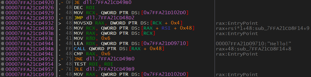 The start of the functions look almost exactly the same. At this point, we can be pretty confident that the function SayHello() is calling is std::cout. Let’s take a look at the jump instruction at the end of the SayHello() function and see what we can find there. Here is the code that is jumped to: